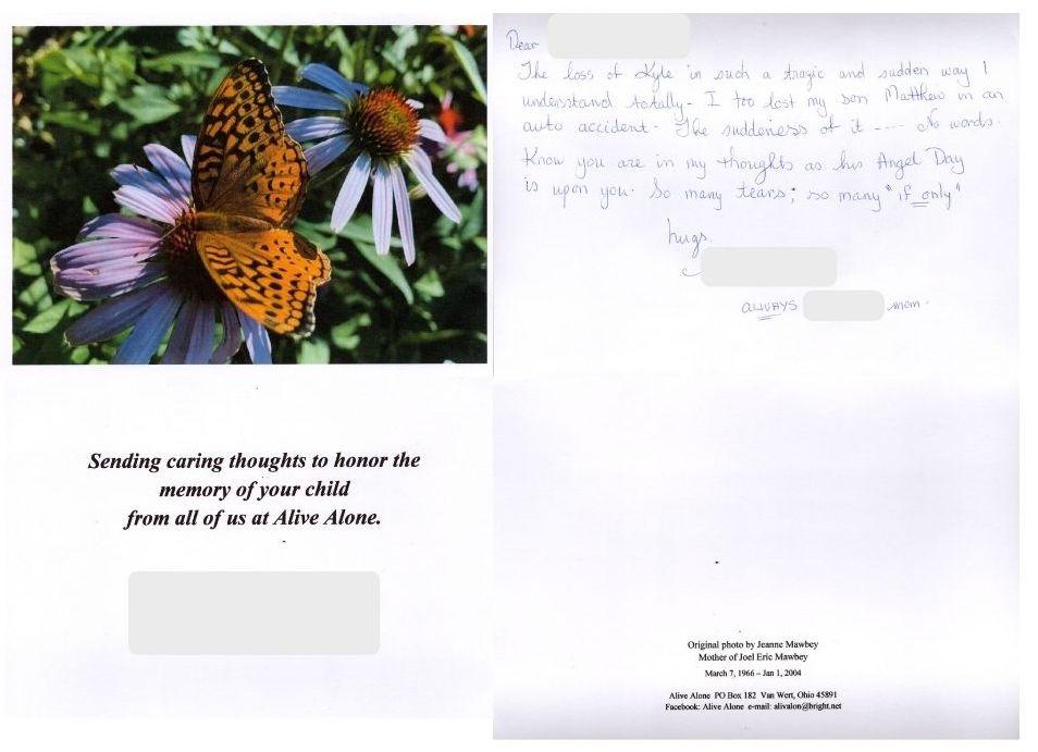 Alive Alone has members who volunteer to write personalized Care Notes that arrive near your child’s or children’s date of birth and date of death. These are handwritten notes from another grieving parent.
